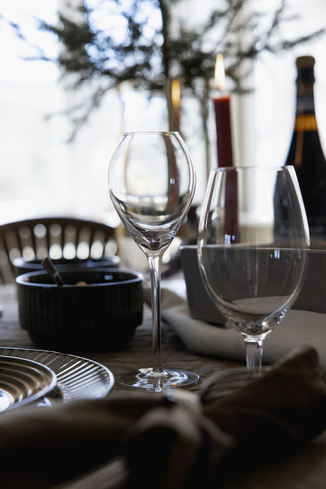 Saga champange glass is a part of our new glass collection including wine glass, champagne glass, champagne saucer, drinking glass and a carafe, all of which will take their special place in the kitchen cabinet. With its characteristic striped stem, on all of the parts, it stands out as well as blends in. Saga is perfect for the morning juice or the pancake milk, but it also has the power and strength to highlight any party dinner table in an extra festive manner.
