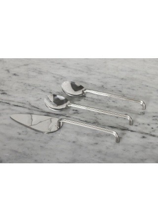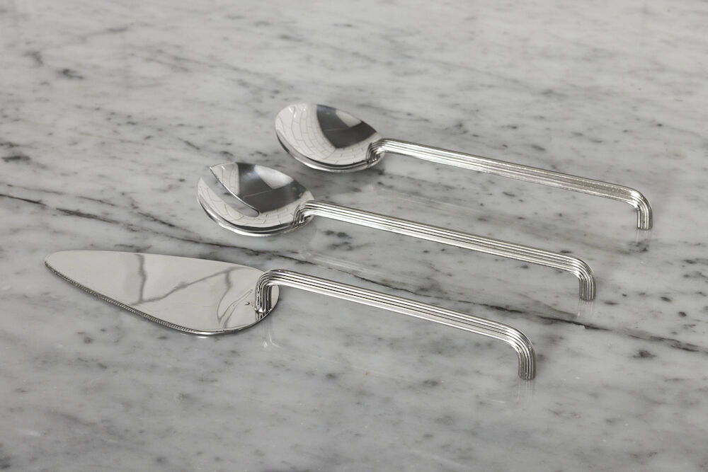 Salad servers designed with both shape and function in mind. The soft rounded shape with beautiful stripes feels timeless. The smart design with a bent detail on the handle makes the cutlery stable and looking good on the table. The bent handle detail also stops the cutlery from sliding into the bowl. Estelle is made of stainless steel and nickel-plated brass.