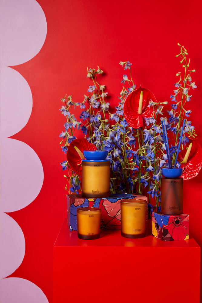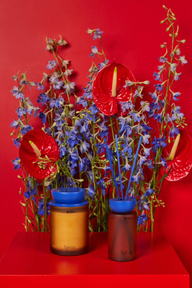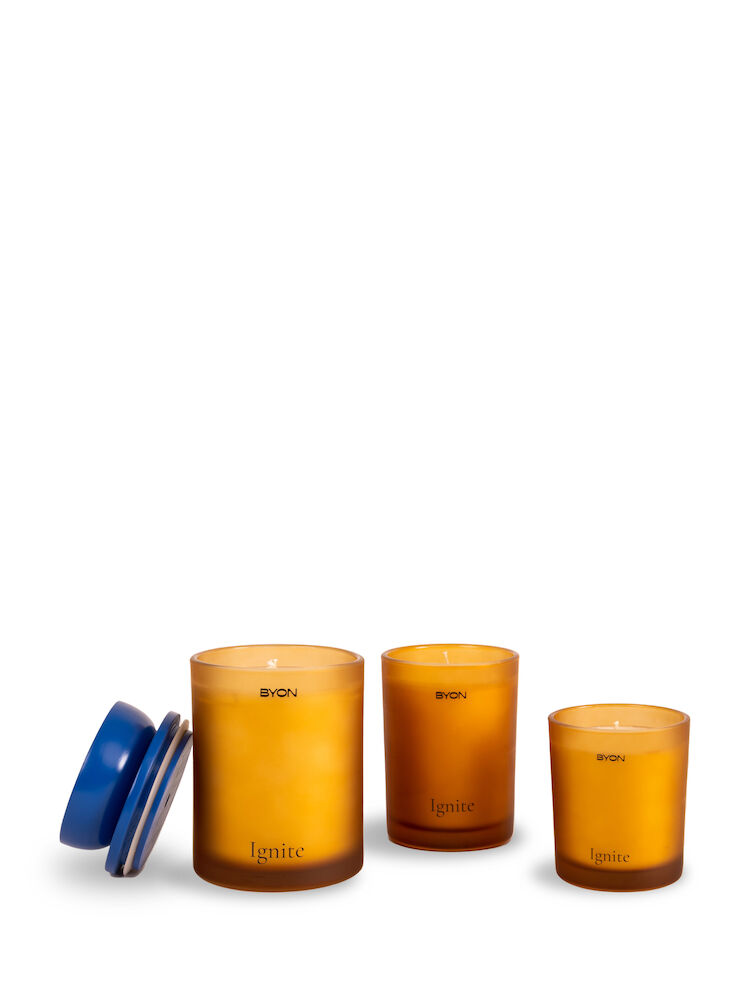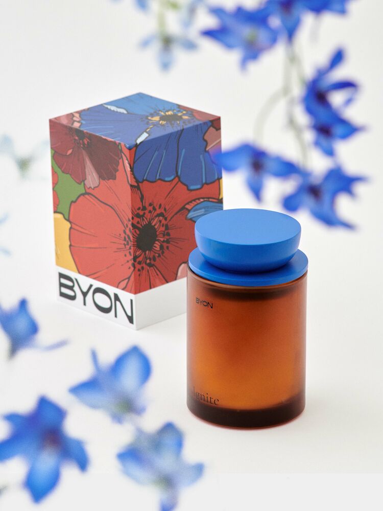 Luxusní interiérová vonná svíčka ve skle jantarové barvy s modrým víčkem. Vytváří příjemnou atmosféru díky vyvážené vůni s ovocnými, květinovými a dřevitými tóny.