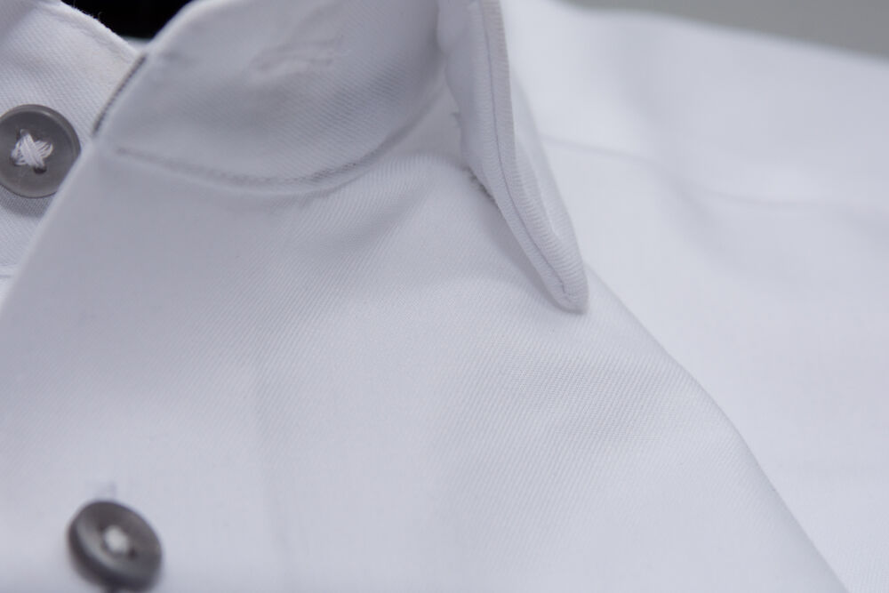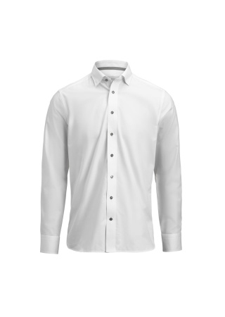 Funkční košile klasického střihu z organické bavlny a recyklovaného polyesteru. Podlepené švy. Límec na skryté knoflíky.