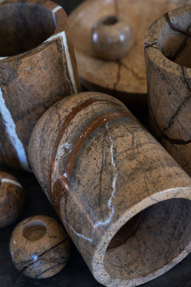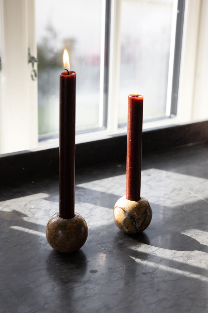 Svícen je vyroben z hnědého lesního mramoru, přičemž každý kus má unikátní vzor. Přírodní žilkování mramoru připomíná větvičky a organické tvary z přírody, díky čemuž každý svícen získává osobní charakter. Navržen pro klasické rustikální svíčky, působí stejně krásně samostatně i ve skupině. Design, který má přežít generace, stejně jako tradice, jež reprezentuje.